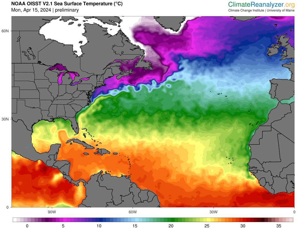 Las temperaturas actuales de la superficie del mar en la cuenca atlántica siguen estando muy por encima de la norma climatológica, por no hablar de los niveles récord. La TSM media de la cuenca atlántica, a 15 de abril de 2024, es de 20,6°C≈69,1°F. Esta temperatura es superior a la temperatura media de la superficie del mar que se observó ese mismo día el año pasado (20,3°C≈68,5°F). Hay que tener en cuenta que 2023 fue el año más cálido registrado en el Atlántico. Ambos valores del 15 de abril (2023 y 2024) están muy por encima de la temperatura media de la superficie del mar en 30 años (1982-2011) de 19,6°C/67,3°F para la fecha (15 de abril).