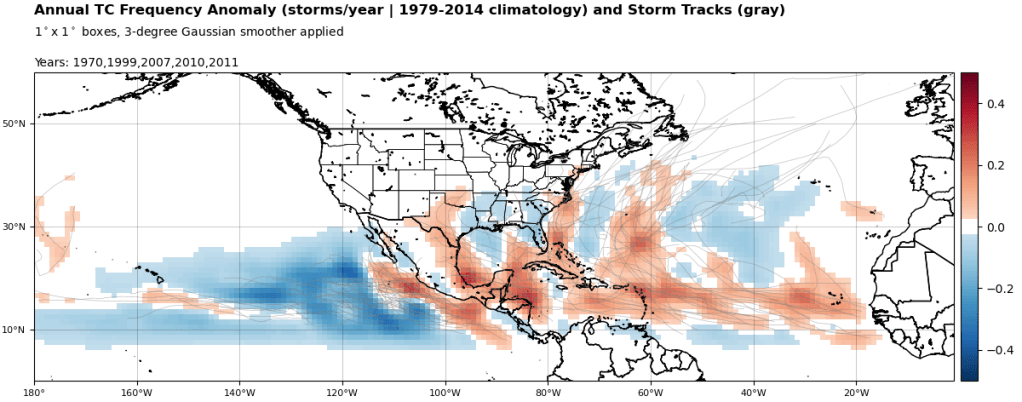 Los 5 análogos basados en la previsión de anomalías de la temperatura superficial del mar NMME para agosto-septiembre-octubre de 2024 son 1970, 1999, 2007, 2010, 2011; siendo todas ellas temporadas de huracanes por encima de la media. Estos análogos se encuentran en la imagen inferior.