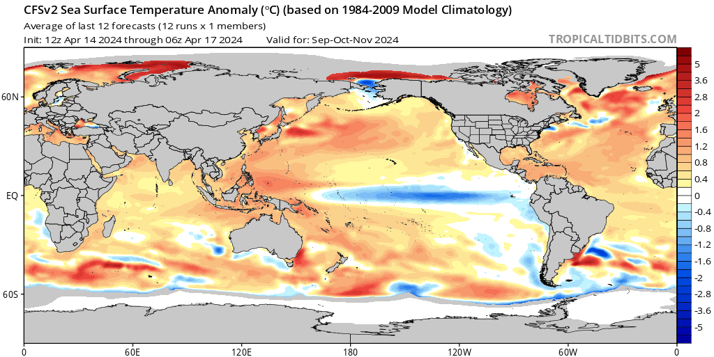 De cara al futuro, el Centro de Predicción del Clima (CPC) prevé una transición de la actual fase de El Niño a una fase ENSO neutra (ni El Niño ni La Niña) entre abril y junio de 2024 (85% de probabilidad). Esto también incluye una probabilidad del 60% de que La Niña se forme en junio de 2024, persistiendo durante el resto de la temporada de huracanes a partir de entonces.