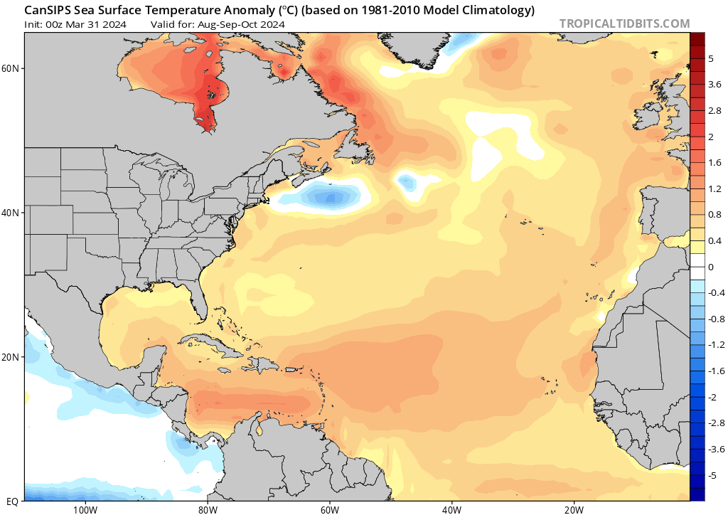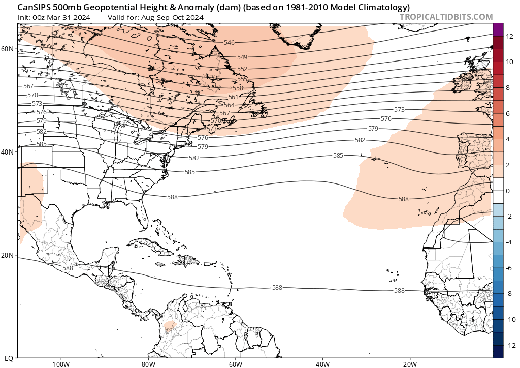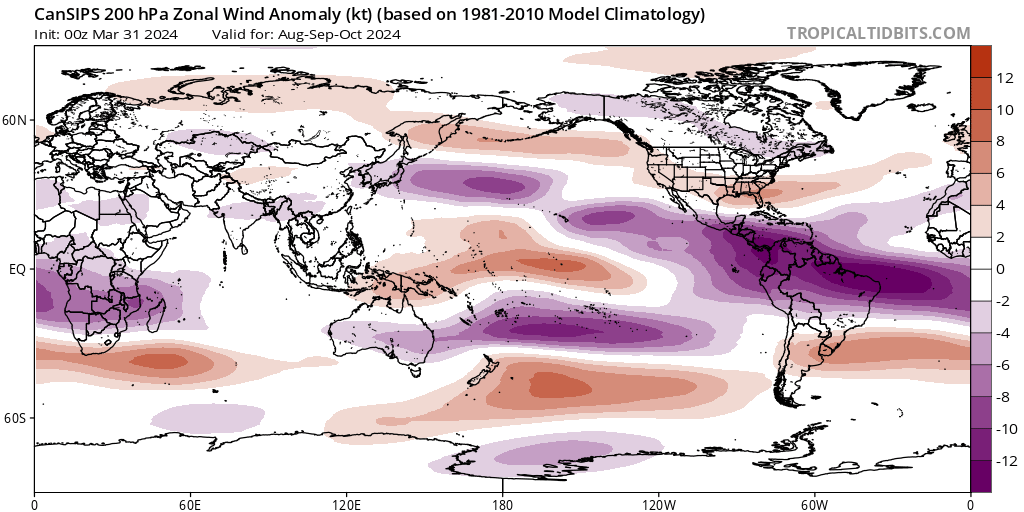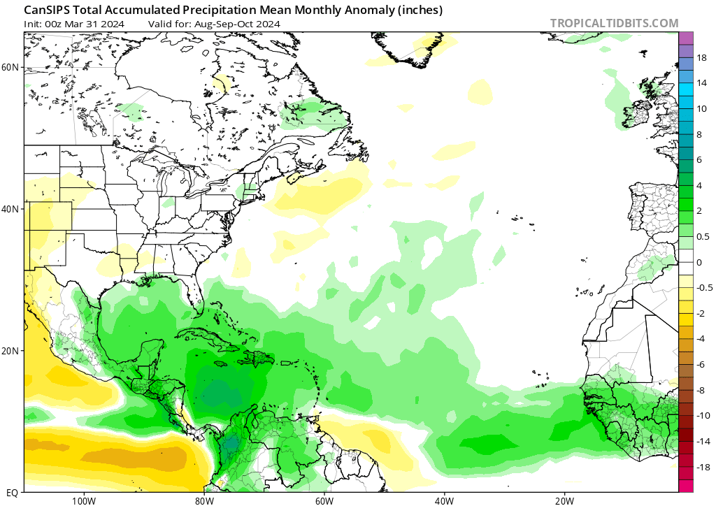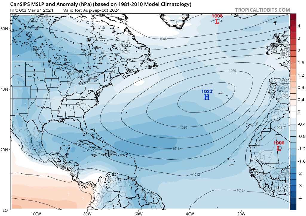 El modelo CanSIPS muestra un resultado similar, pero con una dorsal subtropical mejor definida durante los tres primeros meses de la temporada de huracanes (junio, julio y agosto de 2024) y un deterioro de las características a partir de entonces. El CanSIPS hace que la alta presión continental se desarrolle un mes después que el CFS, en septiembre y no en agosto. Esto podría poner a EE.UU. en riesgo de tocar tierra por tormentas que se aproximen desde los trópicos profundos hasta que se desarrolle esa dorsal continental. Fuera de EE.UU., las islas del Caribe, desde las Antillas Menores hasta las Antillas Mayores, también corren el riesgo de sufrir el impacto de ciclones tropicales en función de las fluctuaciones de la posición y la intensidad de la dorsal subtropical. Esto se aplica principalmente a los tres primeros meses de la temporada de huracanes hasta agosto, antes de que la dorsal continental se consolide y la dorsal subtropical se retire hacia el este y se degrade.