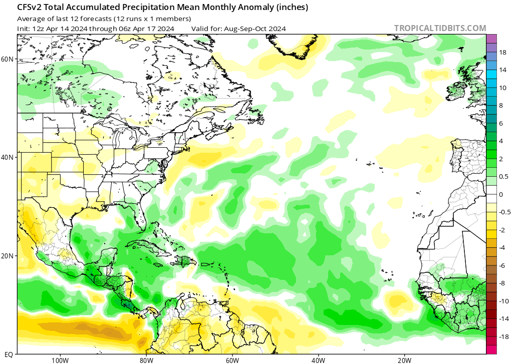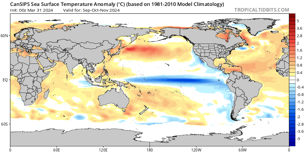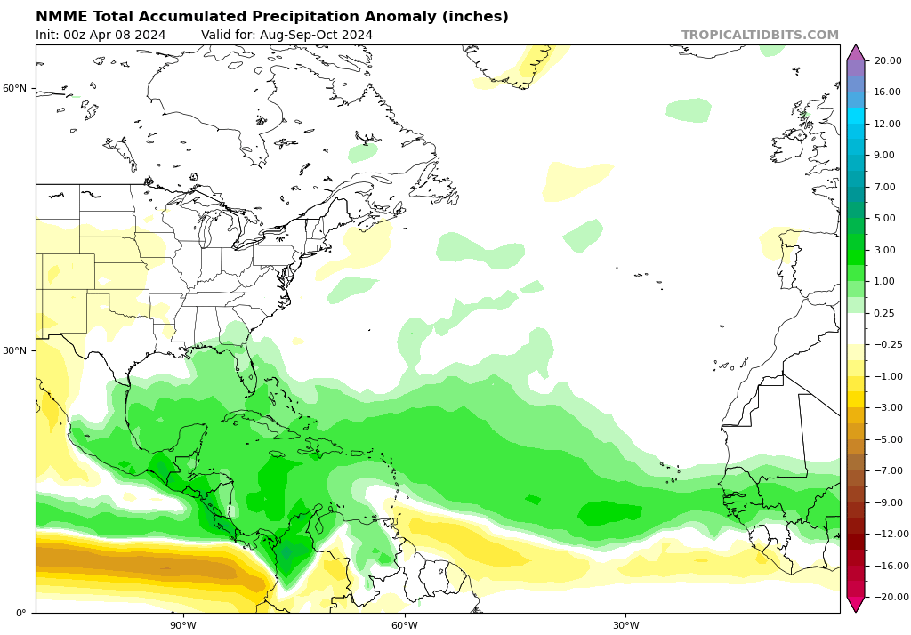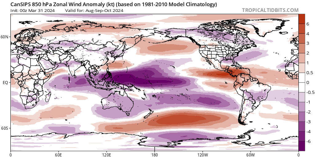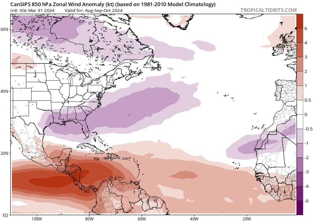 El modelo CanSIPS muestra un resultado similar, pero con una dorsal subtropical mejor definida durante los tres primeros meses de la temporada de huracanes (junio, julio y agosto de 2024) y un deterioro de las características a partir de entonces. El CanSIPS hace que la alta presión continental se desarrolle un mes después que el CFS, en septiembre y no en agosto. Esto podría poner a EE.UU. en riesgo de tocar tierra por tormentas que se aproximen desde los trópicos profundos hasta que se desarrolle esa dorsal continental. Fuera de EE.UU., las islas del Caribe, desde las Antillas Menores hasta las Antillas Mayores, también corren el riesgo de sufrir el impacto de ciclones tropicales en función de las fluctuaciones de la posición y la intensidad de la dorsal subtropical. Esto se aplica principalmente a los tres primeros meses de la temporada de huracanes hasta agosto, antes de que la dorsal continental se consolide y la dorsal subtropical se retire hacia el este y se degrade.