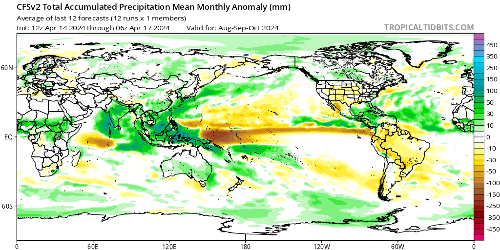Uno de los métodos utilizados para determinar la presencia de El Niño o La Niña es la anomalía de las precipitaciones en el Océano Pacífico ecuatorial. Al analizar el modelo CFS, éste sugiere que el Pacífico occidental podría tener precipitaciones por encima de la media esta temporada de huracanes con condiciones más secas de lo normal sobre el Pacífico ecuatorial central y oriental durante el mismo periodo de tiempo. Las anomalías más altas mostradas sobre Indonesia y el Pacífico occidental se dan en octubre de 2024, que coincide con el pico de La Niña según este mismo modelo. El modelo NMME también coincide con unas condiciones más húmedas de lo normal sobre el Pacífico occidental e Indonesia y más secas de lo normal sobre el Pacífico ecuatorial central y oriental. El CanSIPS muestra las mismas tendencias pero tiene un pico en las anomalías pluviométricas en un momento posterior (en noviembre de 2024), lo que implica simplemente que el modelo demuestra un pico en la intensidad de La Niña más tarde en la temporada de huracanes.
