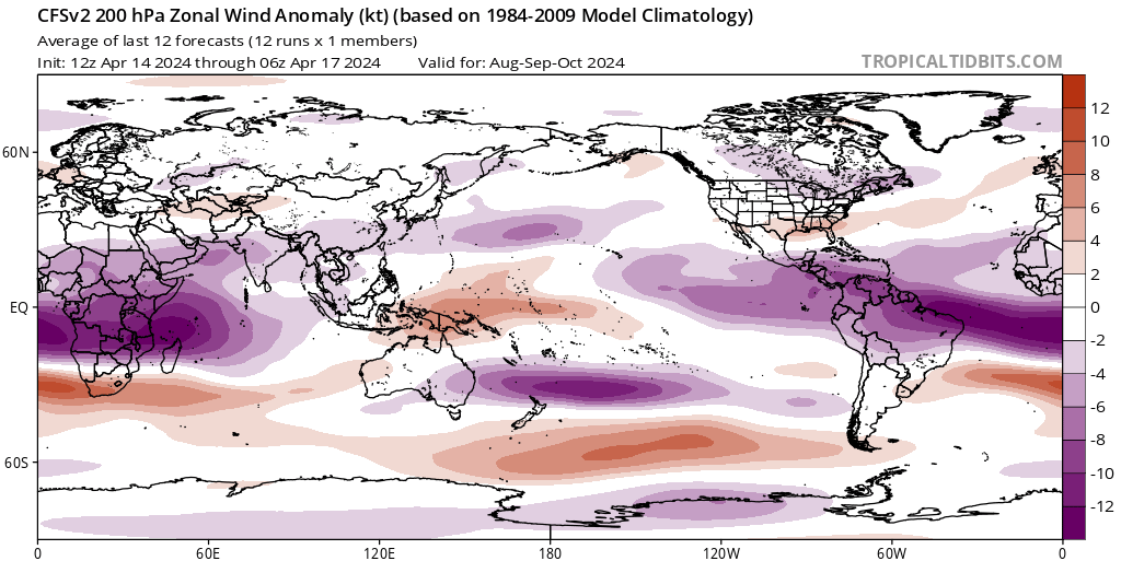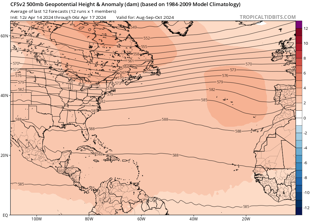 El CFS muestra una dorsal sobre el Atlántico canadiense que mantiene su intensidad hasta agosto, cuando el modelo muestra un debilitamiento de esta dorsal. Esto da paso a una dorsal de niveles superiores sobre el Atlántico subtropical en septiembre-octubre-noviembre de 2024. Sin embargo, el modelo muestra estas dos dorsales simultáneamente hasta agosto. Con estas dos dorsales en su lugar, es probable que se produzca el mismo resultado que en el primer escenario con los patrones de dirección de bajo nivel, es decir, tormentas hacia el mar. Pero una vez que la dorsal subtropical de nivel superior se produzca a partir de septiembre, esto podría aumentar la probabilidad de ciclones tropicales más fuertes moviéndose más al oeste hacia la costa este de los EE.UU., aunque la dorsal parece permanecer lo suficientemente al este como para que esto no sea una gran preocupación. También hay que tener en cuenta que con esas dos dorsales de bajo nivel en su lugar, esto podría muy bien mantener cualquier tormenta agitándose por el momento lejos de tierra.
