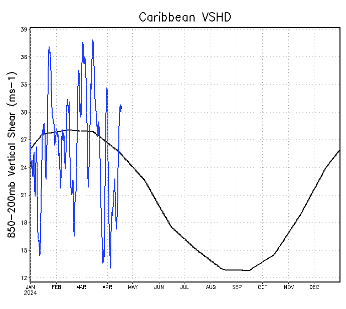 Las anomalías actuales de cizalladura del viento en el Atlántico tropical están por encima de la norma climatológica, en torno a 23,8 ms^-1. Lo mismo puede decirse del Mar Caribe, que actualmente presenta un valor de cizalladura superior a la media, en torno a 31 ms^-1. Con el paso del tiempo, estos valores de cizalladura deberían disminuir a medida que nos acercamos a los meses álgidos de la temporada de huracanes.