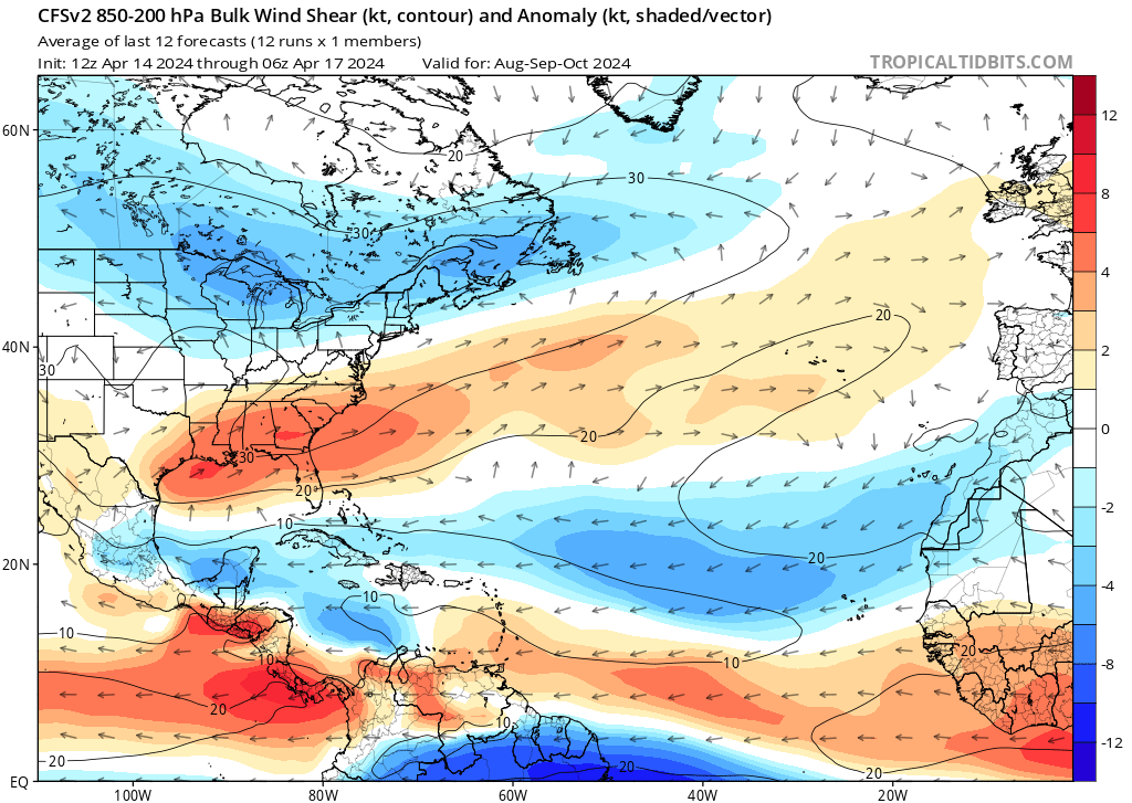 La cizalladura del viento, que se define como el cambio en la velocidad o dirección del viento con la altura, es un producto de ENSO y otro importante factor que contribuye o inhibe la temporada de huracanes en el Atlántico. Los huracanes requieren un desarrollo vertical para organizarse e intensificarse, pero la cizalladura del viento puede, a veces, interrumpir este proceso inclinando la corriente ascendente de la tormenta. Una cizalladura del viento anómalamente fuerte es lo que normalmente desearíamos para una temporada de huracanes, pero no parece ser el caso para la temporada 2024.