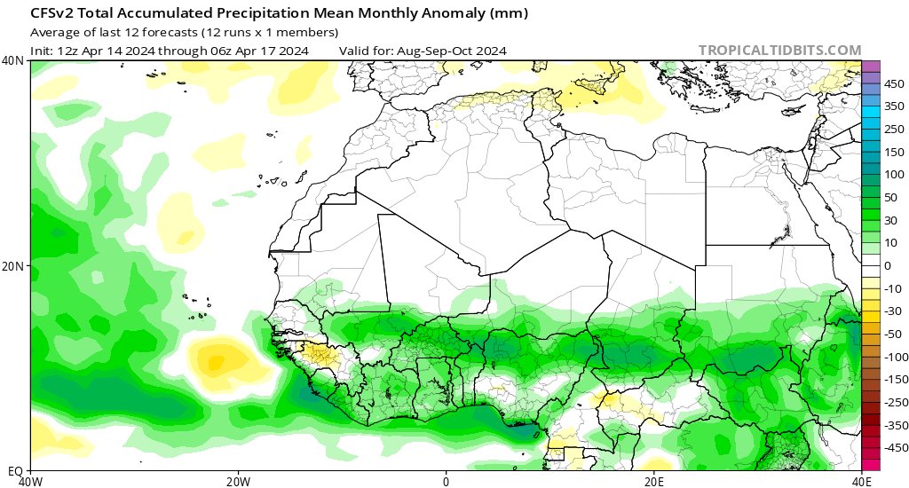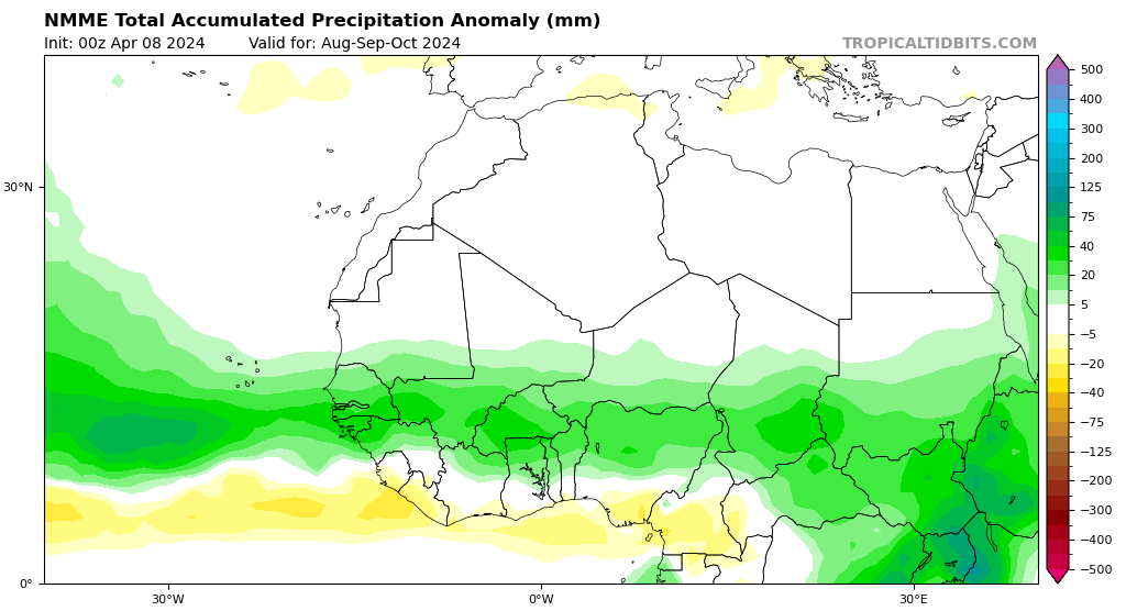 El CFS predice que el norte de África tendrá precipitaciones por encima de la media durante toda la temporada de huracanes, con anomalías máximas durante el periodo de tres meses de julio-agosto-septiembre de 2024. El modelo CanSIPS también muestra condiciones más húmedas de lo normal sobre el norte de África con valores máximos un poco más tarde que el CFS, en agosto-septiembre-octubre de 2024, lo que en última instancia caería dentro de los meses más activos de la MDR. El NMME, de forma similar al CFS, muestra anomalías pluviométricas máximas durante los meses de julio-septiembre-octubre de 2024. Una tendencia común observada entre los modelos es el aumento de las anomalías positivas a medida que avanzan los meses, seguido de una disminución después de cada pico respectivo para los últimos meses de la temporada de huracanes. En general, parece que el monzón norteafricano contribuirá en gran medida a la próxima temporada.