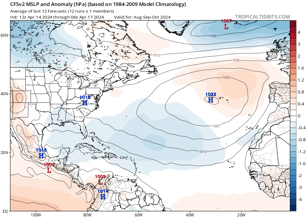 El CFS muestra una dorsal subtropical en deterioro centrada alrededor de las Islas Azores (alta de las Azores) durante los dos primeros meses de la temporada de huracanes (junio y julio). Esto debería guiar a los ciclones tropicales mar adentro hacia la región de las Bermudas, mientras que una dorsal más definida suele favorecer una mayor interacción con Estados Unidos. Además de la escasa estructura de este sistema de altas presiones, el modelo también demuestra la formación de altas presiones continentales sobre la región del Atlántico Medio de Estados Unidos en agosto de 2024 y su mantenimiento hasta el final de la temporada. Con un sistema de alta presión estacionado sobre el este de EE.UU. y otro cerca de las Azores, esto tiende a reforzar la lógica de las tormentas hacia el mar. Los ciclones tropicales no pueden desplazarse a través de las dorsales de alta presión, sólo alrededor de ellas. Mientras las altas presiones se sitúen sobre el este de EE.UU., debería disminuir el riesgo de que toquen tierra. Dependiendo de la posición de esta dorsal continental, podría aumentar el riesgo en el oeste del Golfo de México y Centroamérica.