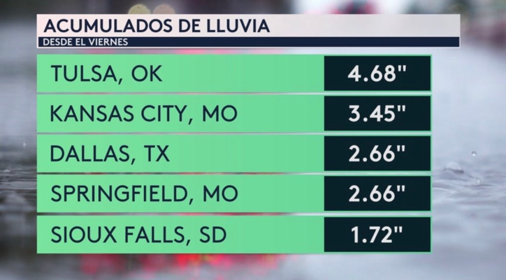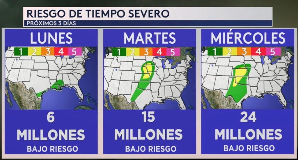 •El riesgo de tiempo severo sigue esta semana: hoy desde Texas hasta Alabama, pero será un riesgo marginal; desde Texas hasta Minnesota mañana y desde Texas hasta Iowa el miércoles donde las mismas zonas afectadas este fin de semana estarán bajo riesgo