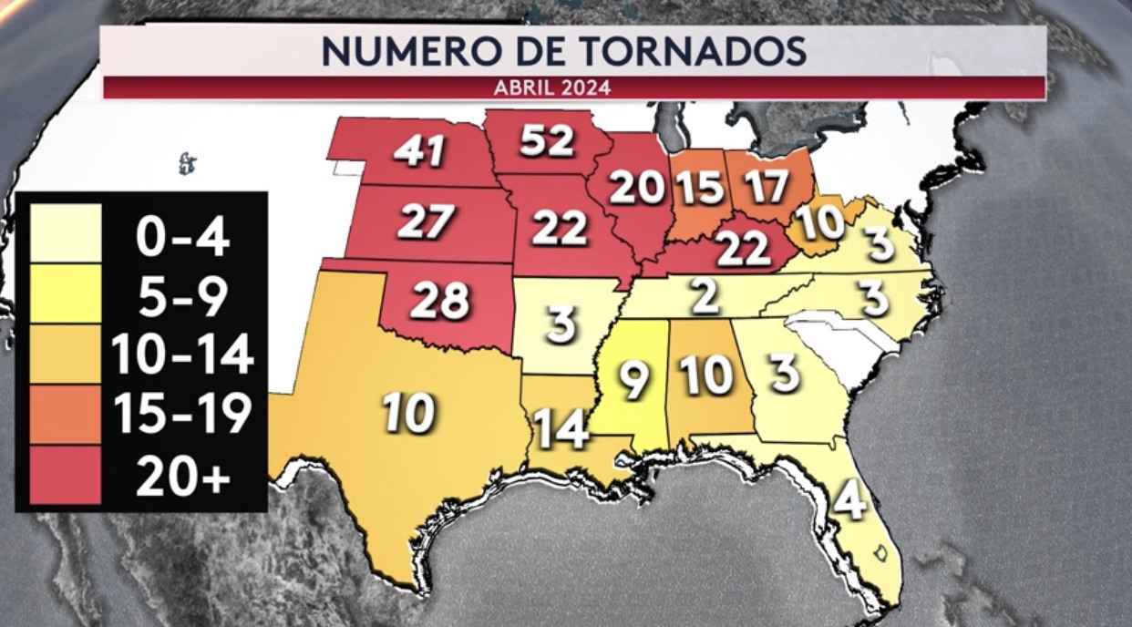 •Número de tornados registrado este mes por estado. Se ha registrado 52 tornados en Iowa y 41 en Nebraska. ¡El número de tornados promedio para el mes de abril en Iowa es 7 y en Nebraska: 4!