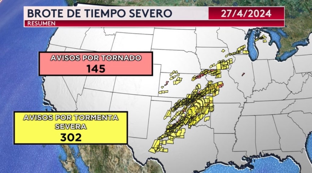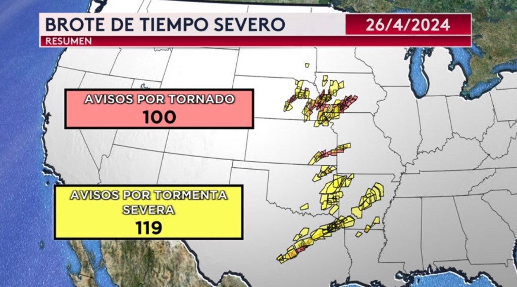 •Resumen del brote de tiempo severo del fin de semana pasado. Se registraron 100 avisos por tornados y 119 avisos por tormenta severa el viernes y 145 avisos pie tornado y 302 avisos por tormenta severa el sábado