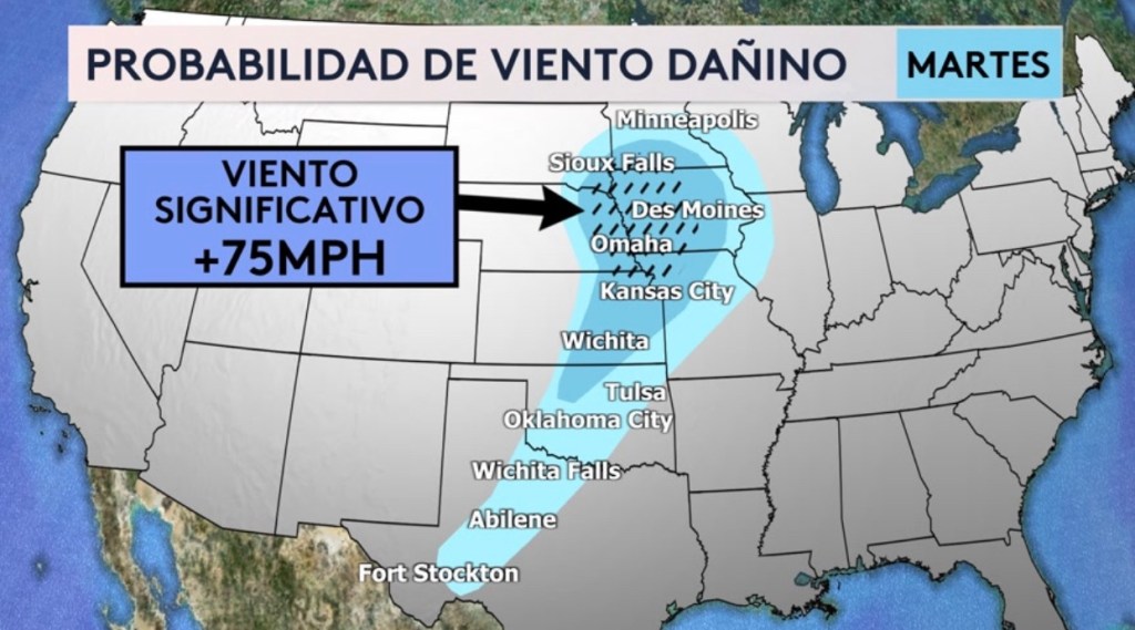 •Probabilidad de viento dañino hoy donde se pudiera registrar ráfagas más fuertes de más de 75 mph para ciudades como Omaha y Des Moines