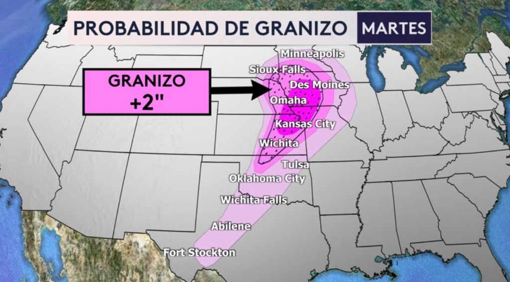 •Probabilidad de granizo hoy donde ciudades como Wichita, Kansas City, Omaha, Des Moines y Sioux Falls pudieran observar granizo de más de 2” en diámetro