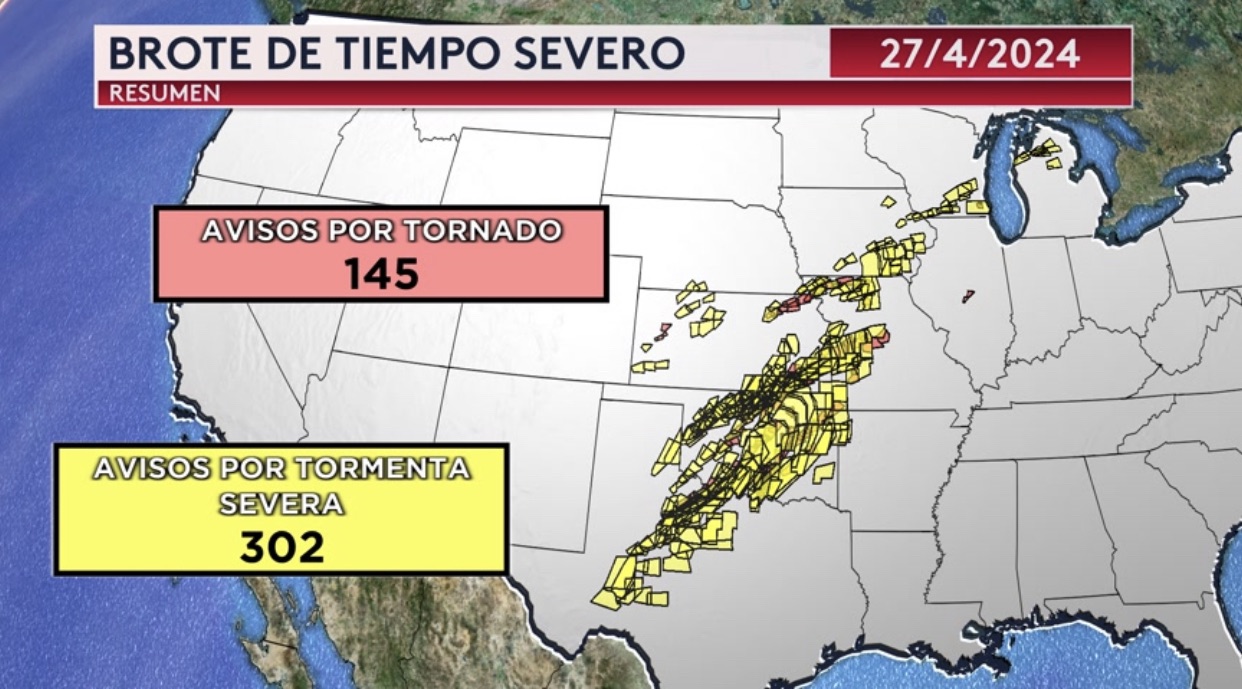 •Resumen del brote de tiempo severo del fin de semana pasado. Se registraron 100 avisos por tornados y 119 avisos por tormenta severa el viernes y 145 avisos pie tornado y 302 avisos por tormenta severa el sábado