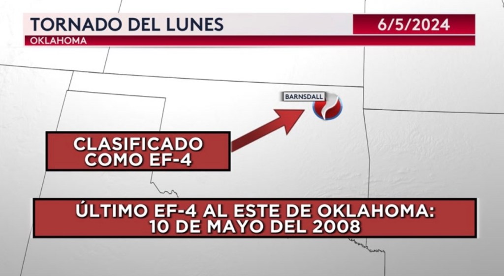 •El tornado de Barnsdall en el estado de Oklahoma que ocurrió el lunes ha sido clasificado como EF-4. Recuerda que la escala de tornados llega a EF-5. El último tornado de EF-4 que ocurrió al este de Oklahoma fue el 10 de mayo del 2008