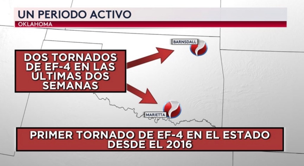 •En las últimas dos semanas, se han registrado 2 tornados catastróficos de EF-4. Antes de estos dos tornados, la última vez que se registró un tornado de EF-4 en el estado de Oklahoma fue en el 2016
