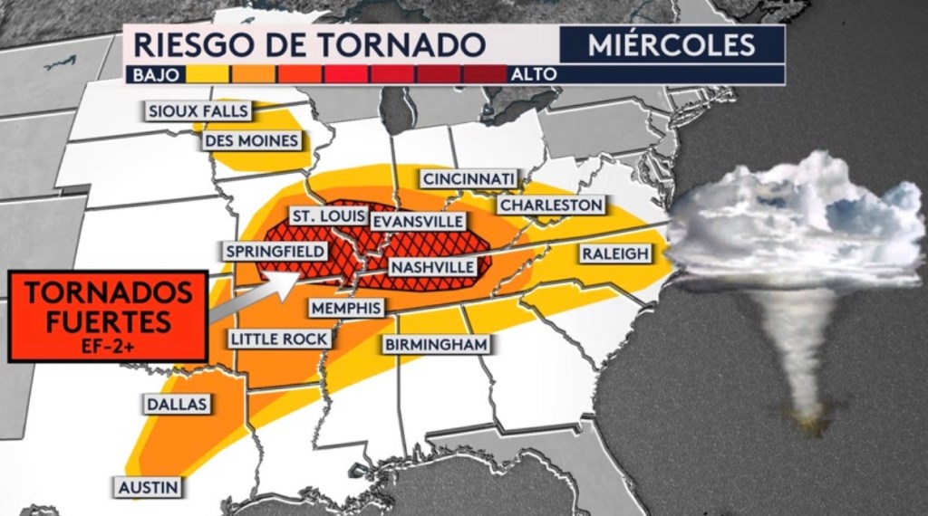 •Tornados fuertes son posibles para ciudades como Nashville, Evansville, St. Louis y Springfield