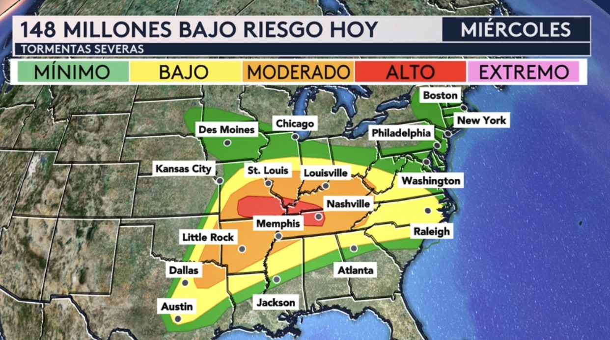•Habrá un riesgo de inundaciones, especialmente esta noche, desde Texas hasta los Valles de Tennessee, Ohio, Mississippi y el Medio Oeste. La ciudad de Nashville estará bajo el mayor riesgo en la sombra roja