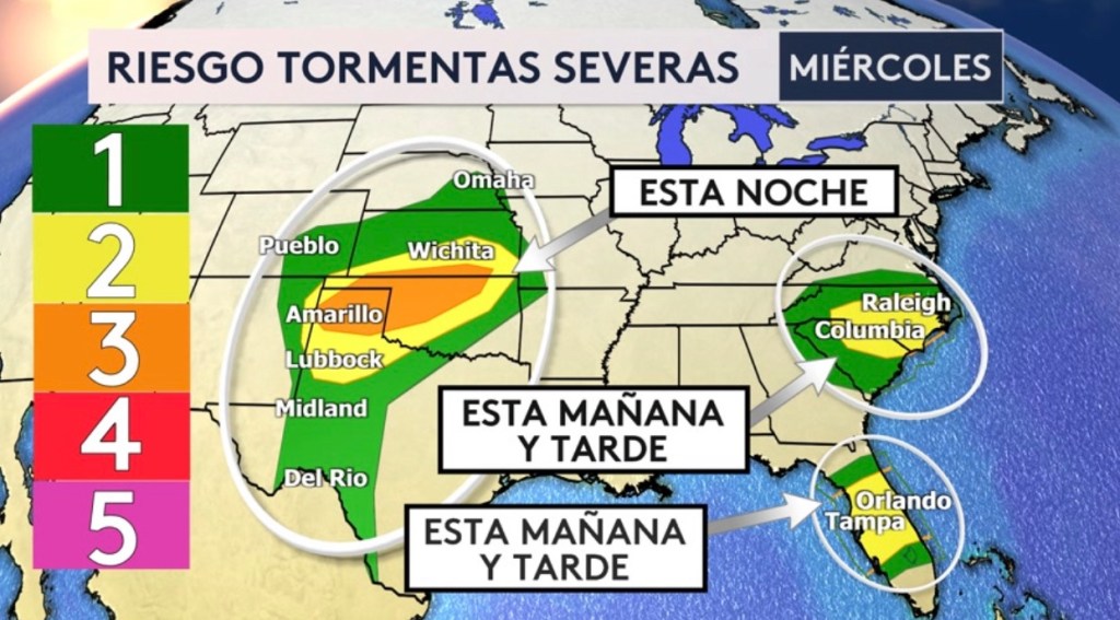 •Hay 3 zonas de tiempo severo hoy: esta mañana y tarde para las Carolinas y el centro de la Florida y esta noche desde Texas hasta Nebraska. Tornados, granizo y viento dañinos serán posibles en todas las zonas con viento significativo (75 mph+) posible para Texas, Oklahoma y Kansas