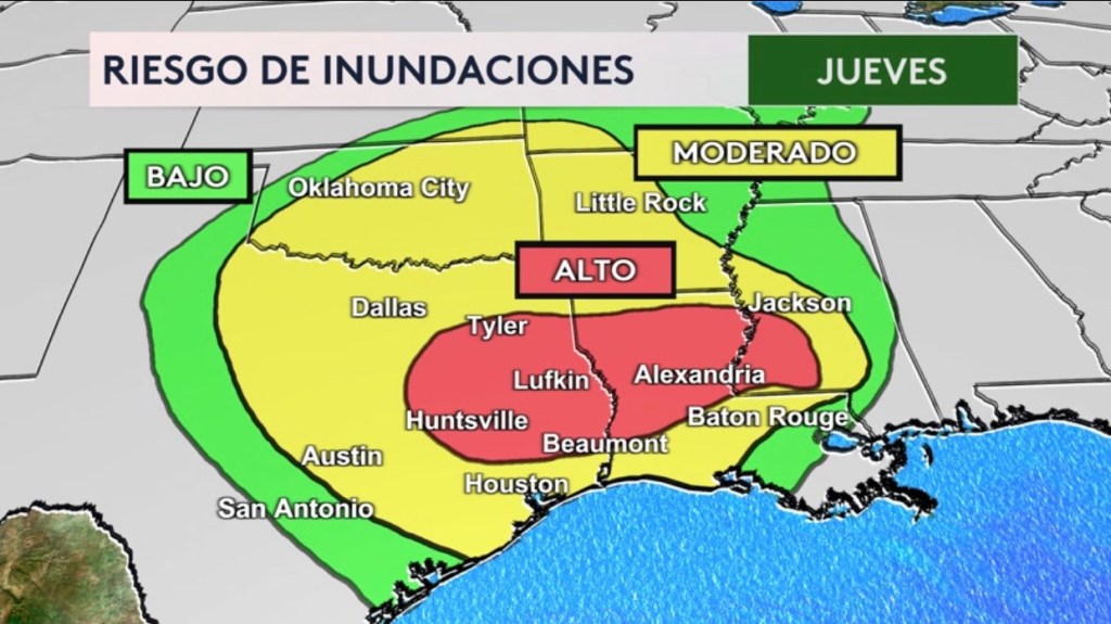 •Estas mismas ciudades estarán bajo el mayor riesgo de inundaciones mañana (sombra roja) junto con el norte de Louisiana y oeste de Mississippi