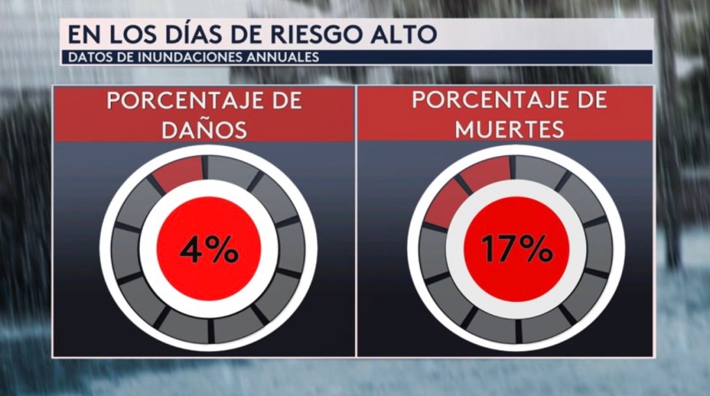 •De todas las muertes por inundaciones al año, el 17% se atribuye a los días de alto riesgo de inundaciones y de todas los daños causados por inundaciones al año, el 4% se atribuye a los días de alto riesgo de inundaciones