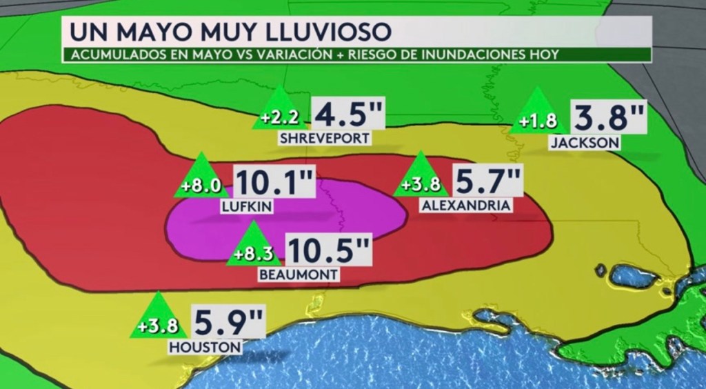 •Ha sido un mayo muy lluvioso para ciudades al este de Texas, que estarán precisamente bajo este riesgo más alto de la escala de inundaciones hoy (sombra rosada). Por ejemplo, Lufkin ha recibido 10” de lluvia este mes, lo cual son 8” por encima del promedio. Beaumont, que estará bajo un riesgo alto (sombra roja), también ha recibido 10” de lluvia este mes cuando su promedio es 2.2”