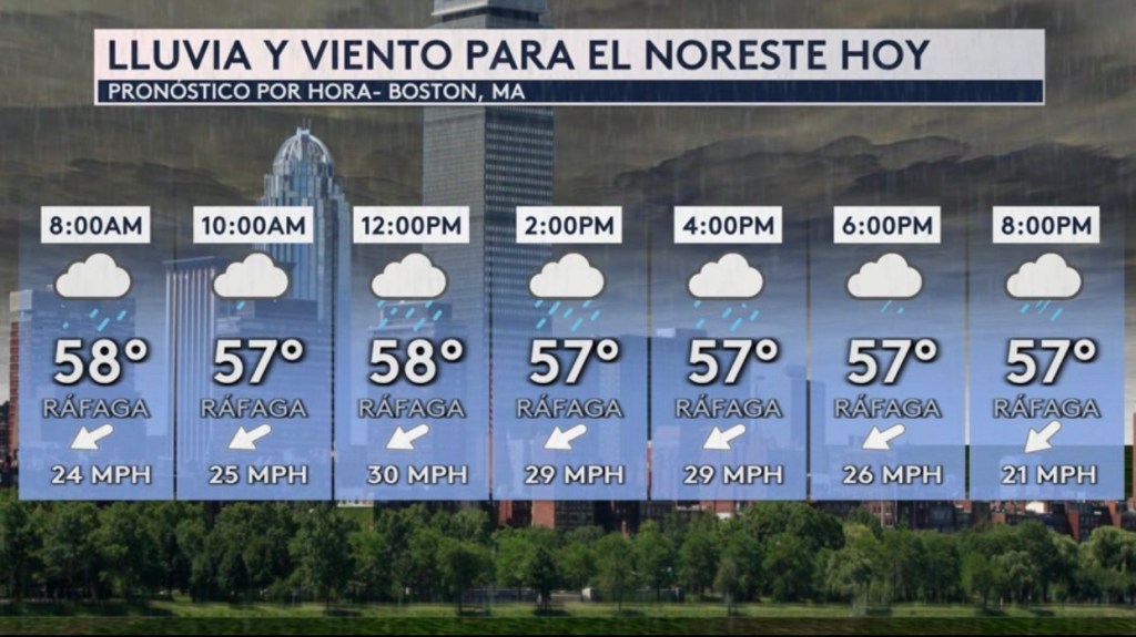 •Pronóstico por hora para Boston, MA mostrando esas fuertes ráfagas y lluvia que también estará presente hoy