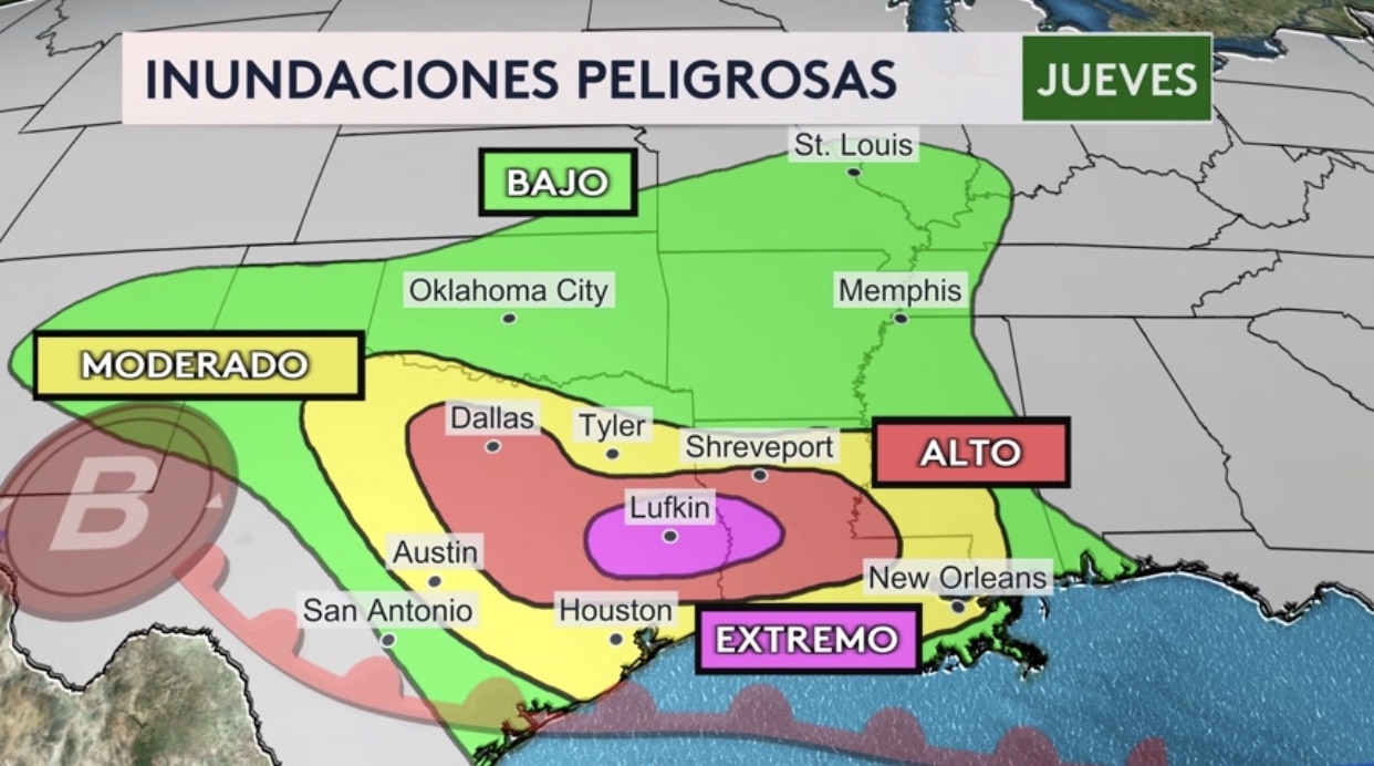 •Con este sistema, habrá un flujo de aire cálido y húmedo desde el Golfo de México que ayudará provocar fuertes precipitaciones. Hay un riesgo EXTREMO (nivel más alto en la escala de inundaciones) para el este de Texas y oeste de Louisiana que incluye las ciudades de Lufkin, Huntsville y Jasper en Texas. El riesgo se desplaza al norte y este mañana con el riesgo más alto en la sombra roja que incluye ciudades como Montgomery y Mobile en Alabama