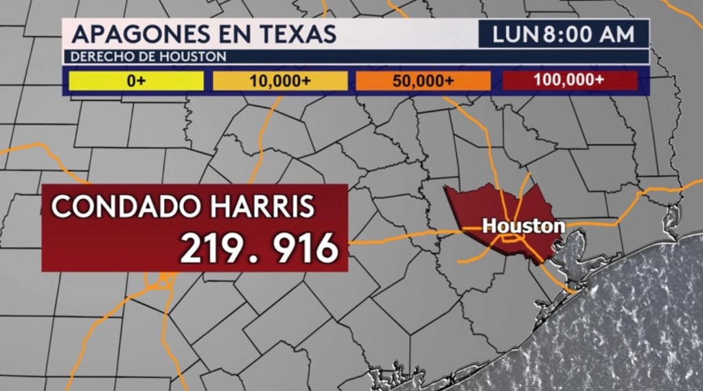 •El condado de Harris en Texas todavía está reportando más de 200.000 apagones esta mañana que incluye la ciudad de Houston después de una fuerte tormenta de viento conocido como un derecho