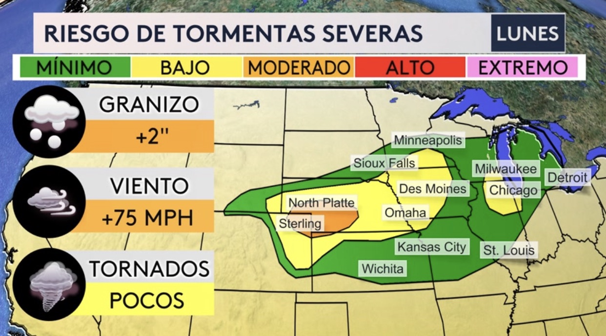 •Habrá riesgo de tormentas severas hoy para las planicies, Medio Oeste y Grandes Lagos. Las amenazas principales serán granizo grande de más de 2” en diámetro y vientos significativos de más de 75 mph, específicamente para la sombra naranja en Colorado, Nebraska y Kansas. Otras ciudades como Chicago, Milwaukee, Des Moines, Kansas City, St. Louis, Detroit y Minneapolis también tendrá la posibilidad de ver vientos dañinos, granizo y tornados
