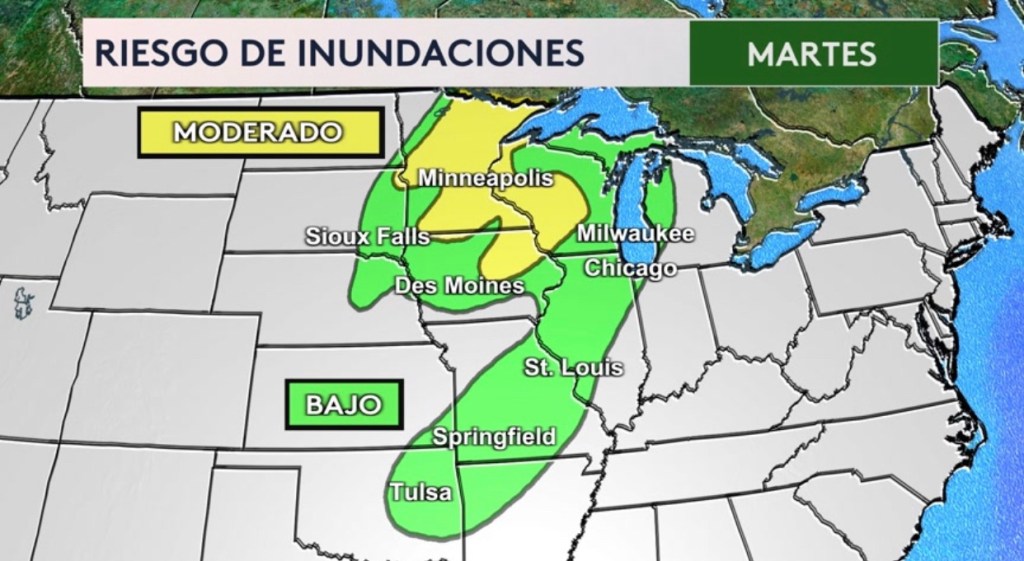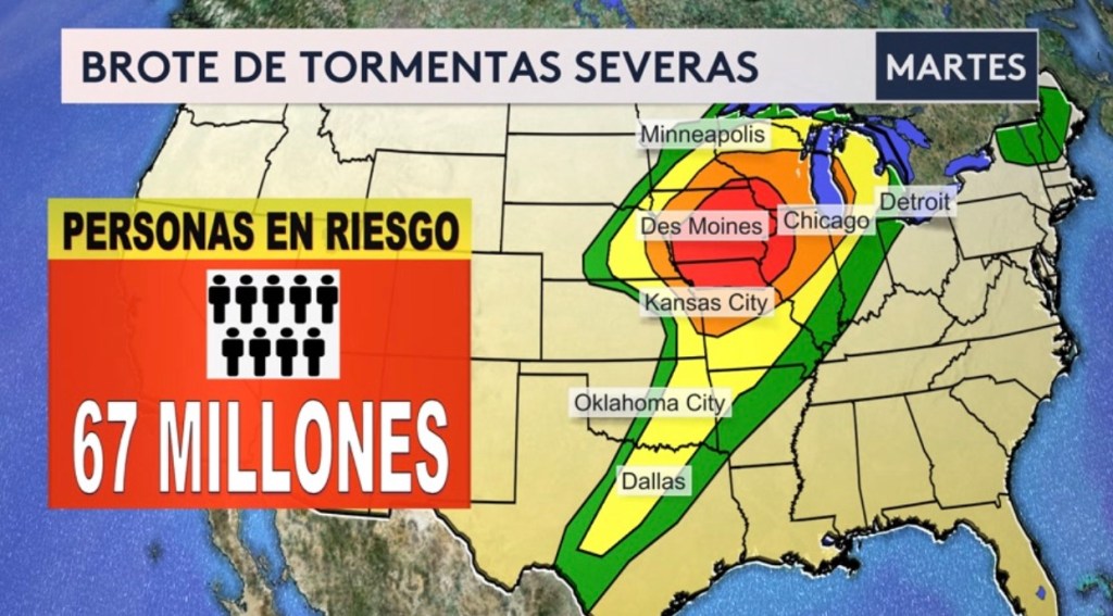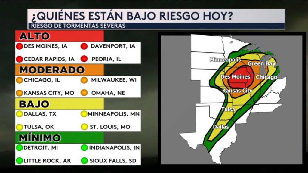 •Las ciudades que estarán bajo riesgo hoy. Los estados en la sombra roja estarán bajo el riesgo más alto (nivel 4 de 5 en la escala de severidad) que incluyen Missouri, Iowa, Illinois, Minnesota y Wisconsin