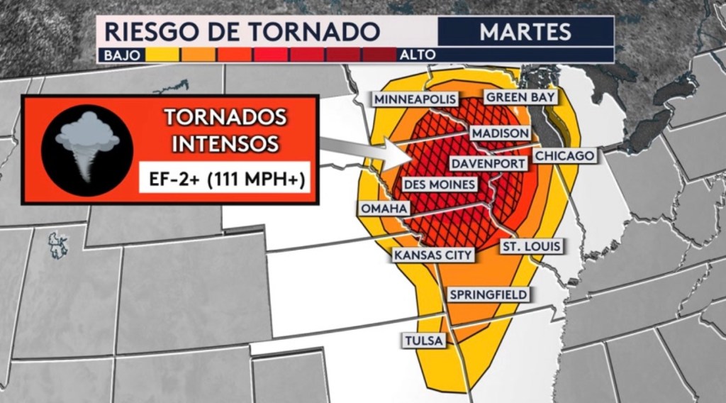 •Riesgo de tornado hoy. El area con las líneas negras muestran el riesgo de tornados intensos de categoría EF-2 o mayor (111 mph+) que incluye las ciudades de Des Moines, Davenport, Cedar Rapids en Iowa; Madison y La Crosse en Wisconsin; Kirksville en Missouri; y Rochester en Minnesota