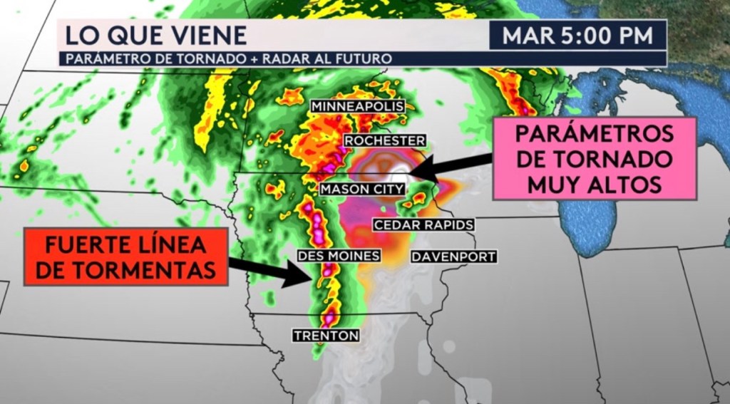 •Radar al futuro para mostrar la llegada de estas tormentas. Esta tarde será lo peor con respecto a las amenazas que hemos discutidos. Una línea de tormentas estará en desarollo alrededor de las 5:00 PM esta tarde, trayendo el riesgo de tornados intensos, vientos significativos y granizo muy grande para Iowa, Minnesota y Missouri. Alrededor de la medianoche, esta línea se expande y llega a ciudades como Chicago, Milwaukee, Green Bay, St. Louis, Springfield y Tulsa; también trayendo el riesgo de tornados (aunque el riesgo de tornados fuertes será más bajo), granizo y vientos fuertes