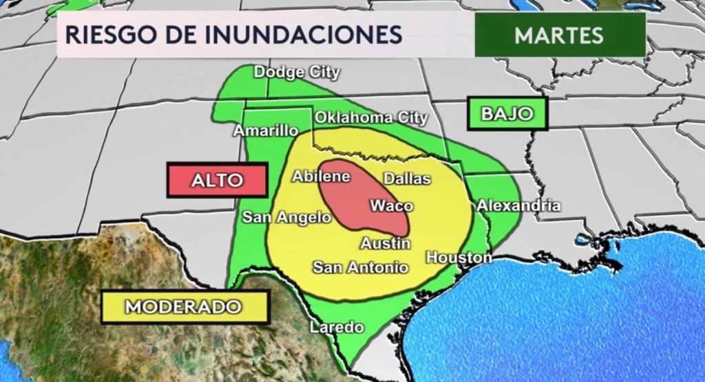 •También habrá una amenaza de inundaciones importantes para Texas, específicamente en la sombra roja donde se encuentra se ciudad de Waco. Otras ciudades como Dallas, Austin, San Antonio y Houston se encuentran bajo un riesgo moderado en la sombra amarilla
