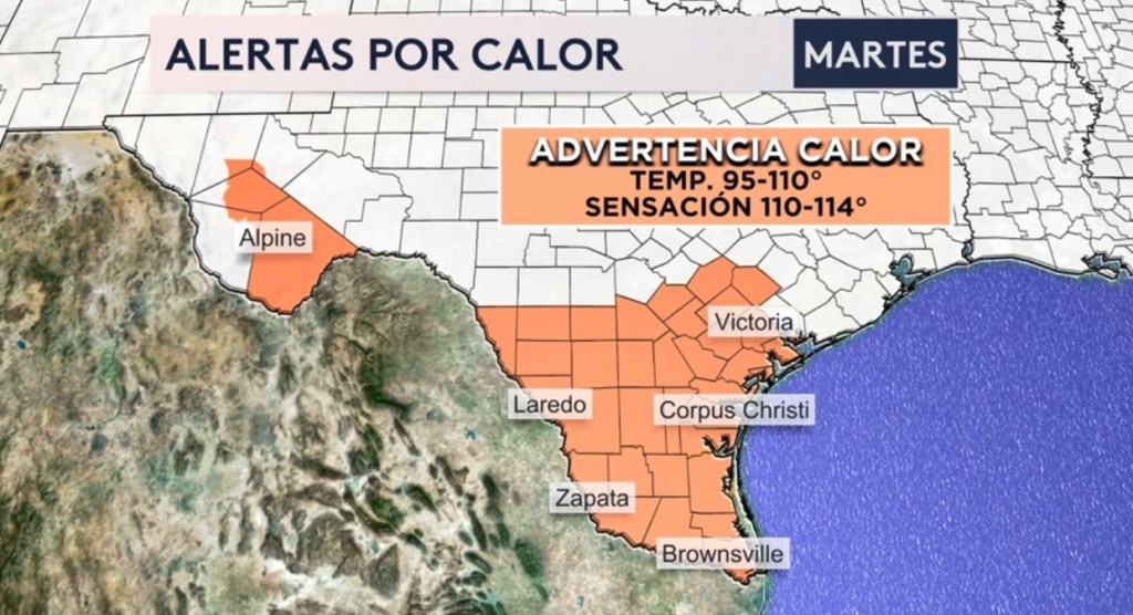 •Alertas por calor para el sur de Texas y el Valle de Río Grande con sensaciones térmicas hasta los 114°