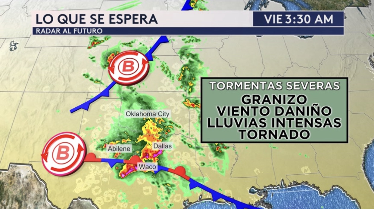 •Radar al futuro mostrando una gran cobertura de lluvias y tormentas luego esta tarde desde las Dakotas hasta el Texas. Con esta actividad de precipitación se presentará los riesgos de granizo, vientos dañinos, lluvias intensas y tornados. Para Dallas, la primera ronda de fuertes lluvias y posible tiempo severo llega luego esta tarde. Por la madrugada, lluvias intensas para Texas y Oklahoma con la segunda ronda de posible tiempo severo legando a Dallas. Mañana al amanecer, estás fuertes precipitaciones estarán llegando al sur de Texas y ciudades como Houston con la amenaza de tiempo severo