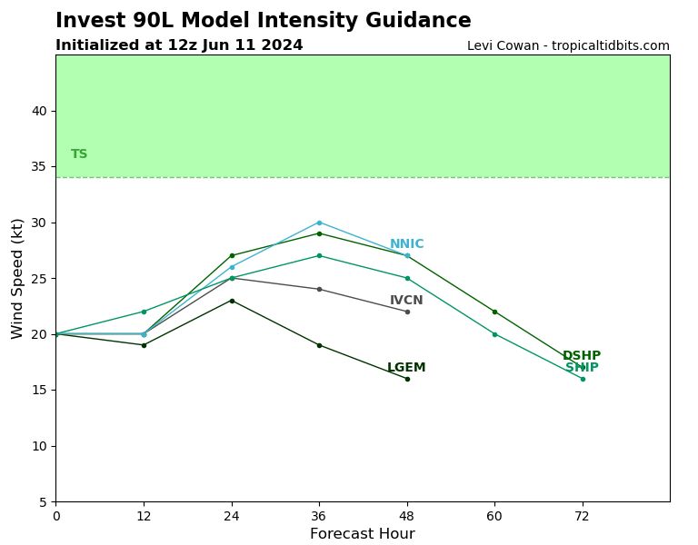•Modelos de intensidad 12z por el momento NO se espera que llegue a ser clasificada cómo Tormentas Tropical o Subtropical. Sujeto a cambios.