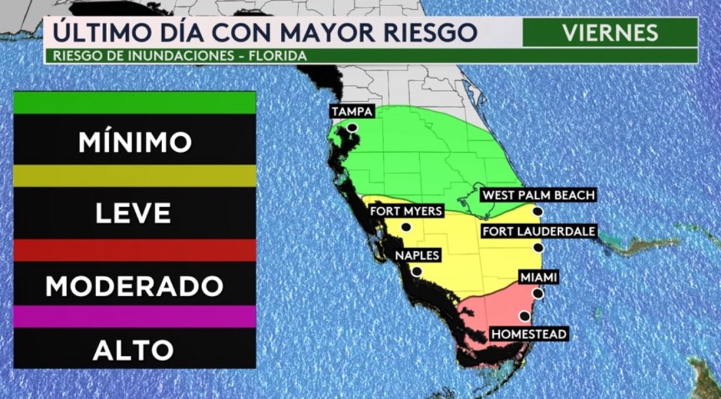 •Las buenas noticas es que hoy sería el último día con fuertes lluvias en la península. Habrá un riesgo moderado (nivel 3 de 4 en la escala de inundaciones) para el sureste y ciudades que incluyen Miami y Homestead. Fort Lauderdale, West Palm Beach, Naples y Fort Myers estarán bajo un riesgo leve