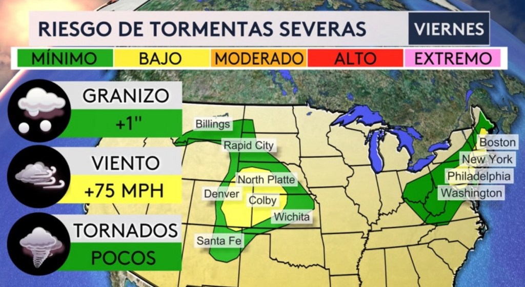 •Habrá dos zonas con riesgo de tormentas severas hoy: el noreste desde Washington hasta Boston donde las amenazas principales serán granizo y vientos dañinos de más de 58 mph y para las planicies y Montañas Rocosas donde las amenazas serán vientos significativos de más de 75 mph, granizo y pocos tornados