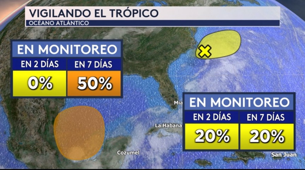 •Estamos vigilando a dos sistemas en el trópico: uno fuera la costa este de los Estados Unidos con una baja probabilidad de desarollo y otro en el suroeste del Golfo de México, lo cual tiene una probabilidad mediana de desarollo la próxima semana. Independientemente de su desarollo, se anticipan fuertes lluvias para México y Texas