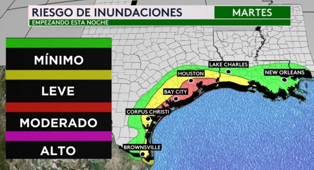 •Hay riesgo de marejada ciclónica, donde se esperan inundaciones costeras entre 1-3 pies desde la Boca del Río Grande hasta Sargent en Texas y desde Sabine Pass en Texas hasta Vermilion/Cameron Parish Line en Louisiana. Se esperan inundaciones de 2-4 pies desde Sargent en Texas hasta Sabine Pass en Texas