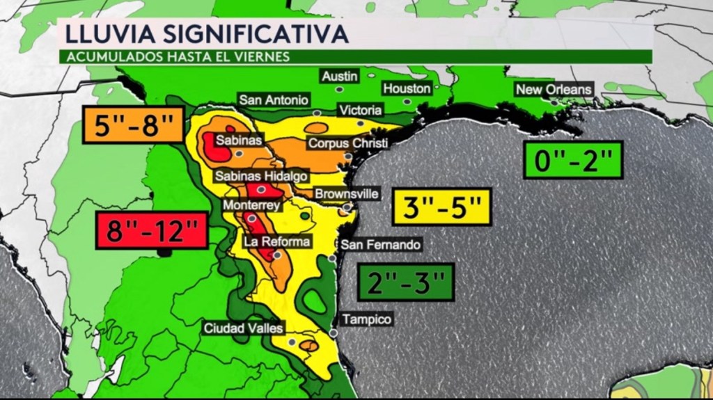 •Acumulados de lluvia desde hoy hasta el viernes. Los acumulados más importantes de 5-12” se concentrarán sobre México para las ciudades de Sabinas, Sabinas Hidalgo, Monterrey y La Reforma en los estados de Coahuila, Nuevo León y Tamaulipas. Para el sur de Texas, entre 3 a 8” son posibles entre las ciudades de Victoria hasta Brownsville lo cual incluye Corpus Christi. San Antonio entre 2-3” y Houston y Austin entre 0-2”