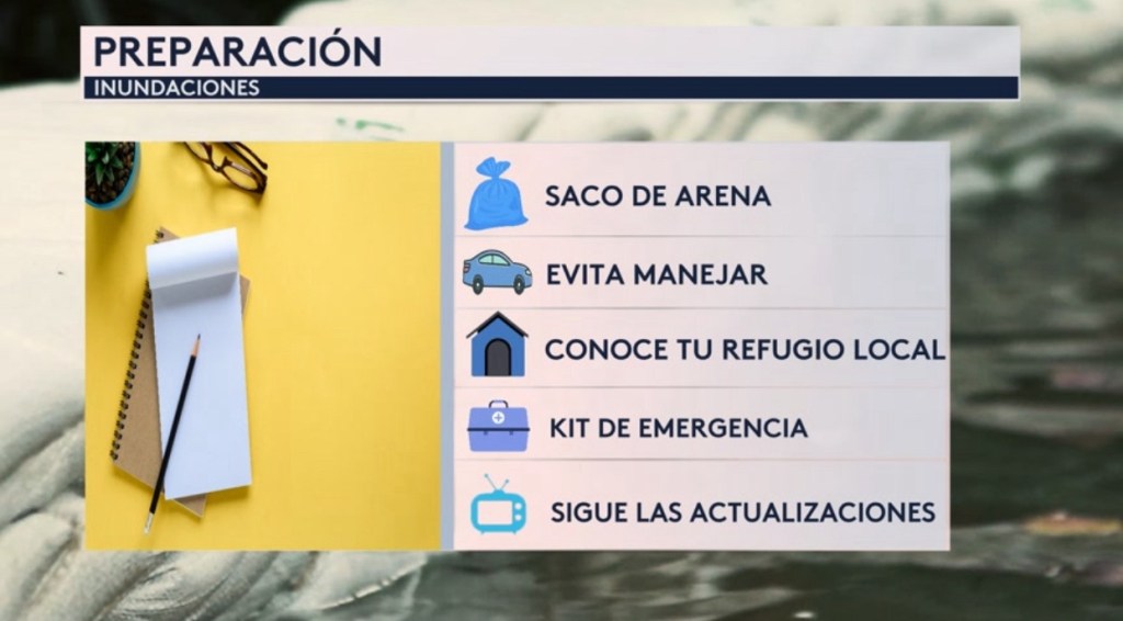 •Preparaciones para las inundaciones: consigan sus sacos de arena, eviten manejar (trata de trabajar desde casa si posible), conozcan sus refugios locales en caso de que te tienes que evacuar, preparen sus kits de emergencia que debe incluir los medicamentos y documentos importantes y sigan las actualizaciones de la tormenta y de las condiciones de tiempo