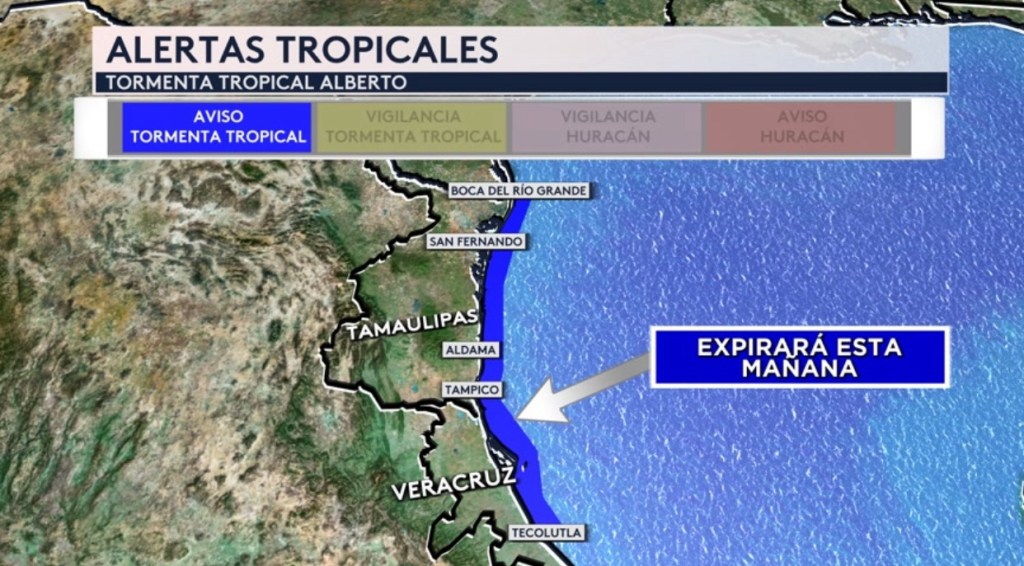 •La tormenta tropical Alberto actualmente está a unas 25 millas al oeste de la ciudad de Tampico en el estado de Tamaulipas en México, donde estamos estimando que tocó tierra o justamente al norte de la ciudad. Los vientos de fuerza de tormenta tropical se extienden 275 millas del centro del sistema, creando gran zona de condiciones ventosas desde los estados de Veracruz y San Luis Potosí en México hasta la ciudad de Brownsville en el sur de Texas