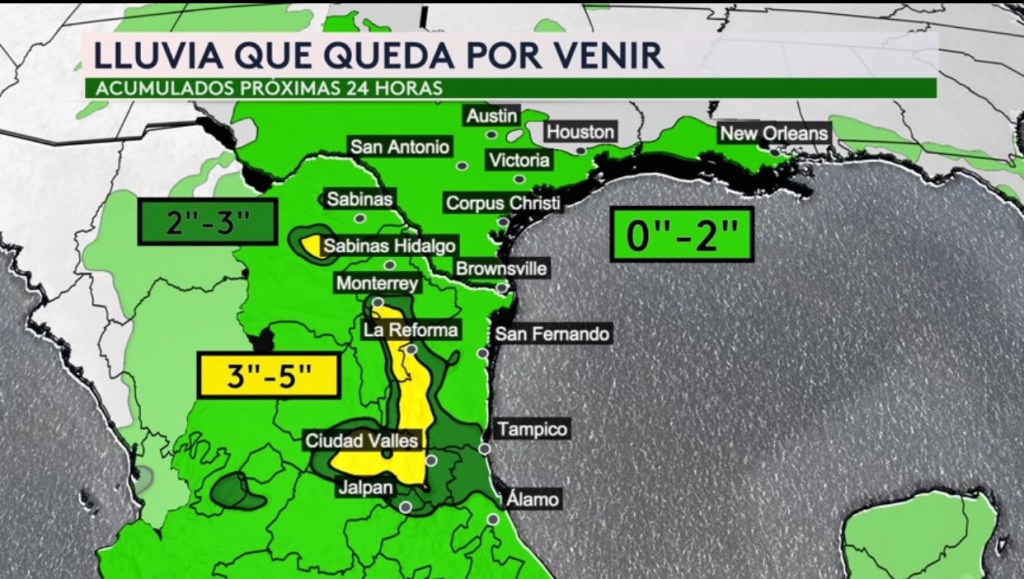 •La lluvia que queda por venir durante las próximas 24 horas. La lluvia más fuerte ya pasó para Texas mientras que todavía se esperan hasta 5” para los estados de Coahuila, Nuevo León, Tamaulipas y San Luis Potosí en México