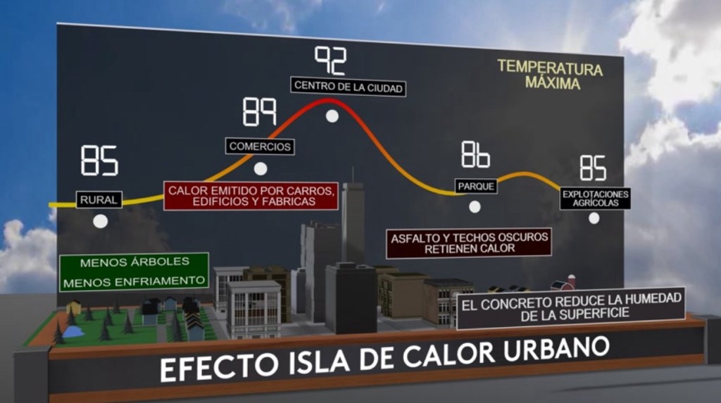 •El efecto de la isla de calor es cuando el centro de una ciudad registran temperaturas más cálidas que las áreas fuera de la ciudad debido al asfalto y techos oscuros reteniendo el calor y al efecto de invernadero debido a las emisiones de los carros, edificios y fabricas