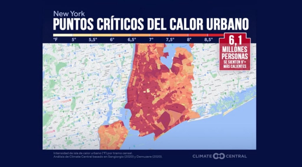 •Por ejemplo 6,1 millones personas que viven en la ciudad de Nueva York están sintiendo temperaturas 9° más calientes debido al efecto por la isla de calor