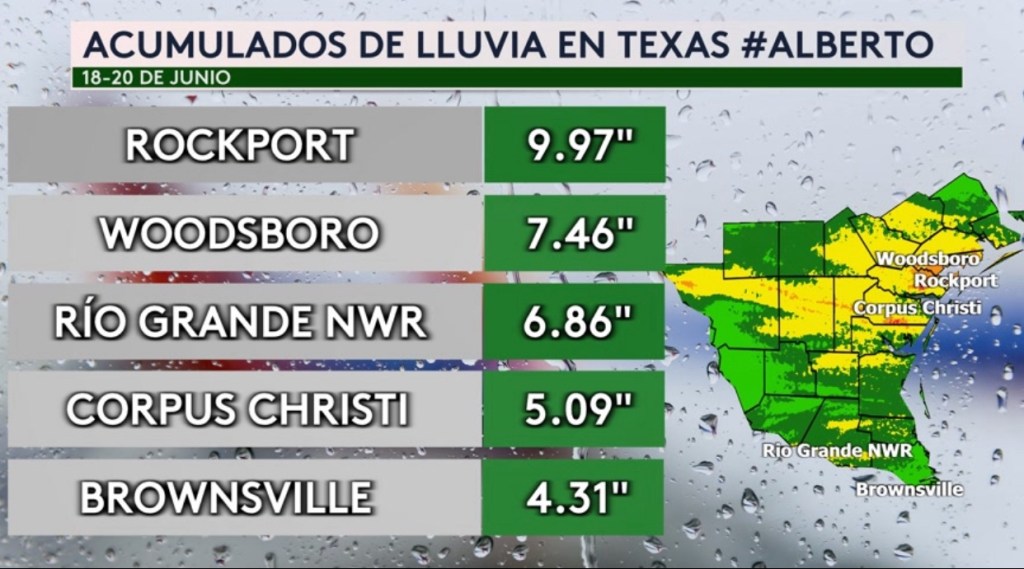 •Acumulados de lluvia más altos en Texas desde el 18 a 20 de junio debido a la Tormenta Tropical Alberto