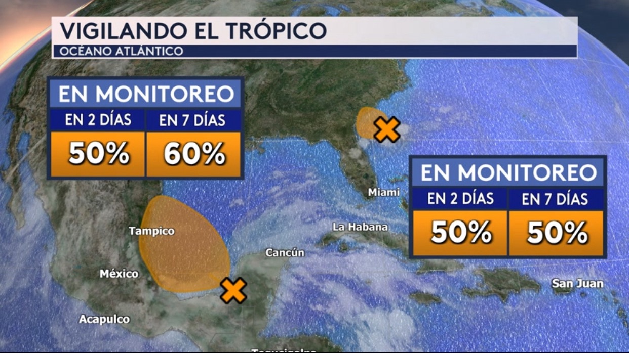 •Esta mañana estamos vigilando a dos sistemas en el trópico: uno fuera de la costa del sureste de los EE. UU. que tiene una probabilidad mediana en formase en una depresión o tormenta tropical breve antes de llegar a la costa del noreste de Florida o de Georgia esta noche y otro que también tiene una probabilidad mediana de formarse este fin semana en el Golfo de México en básicamente la misma zona en la que se formó Alberto
