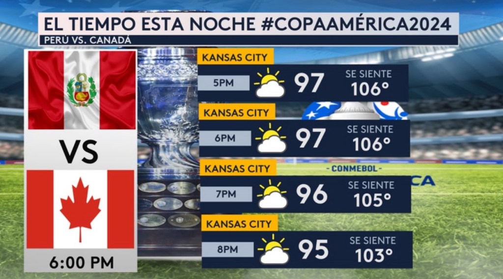 •Pronóstico esta noche para el primer partido de la Copa América entre Perú y Canadá a las 6:00 PM en Kansas City, Missouri. Será una noche caliente con sensaciones térmicas en los tres dígitos hasta después de la puesta del sol