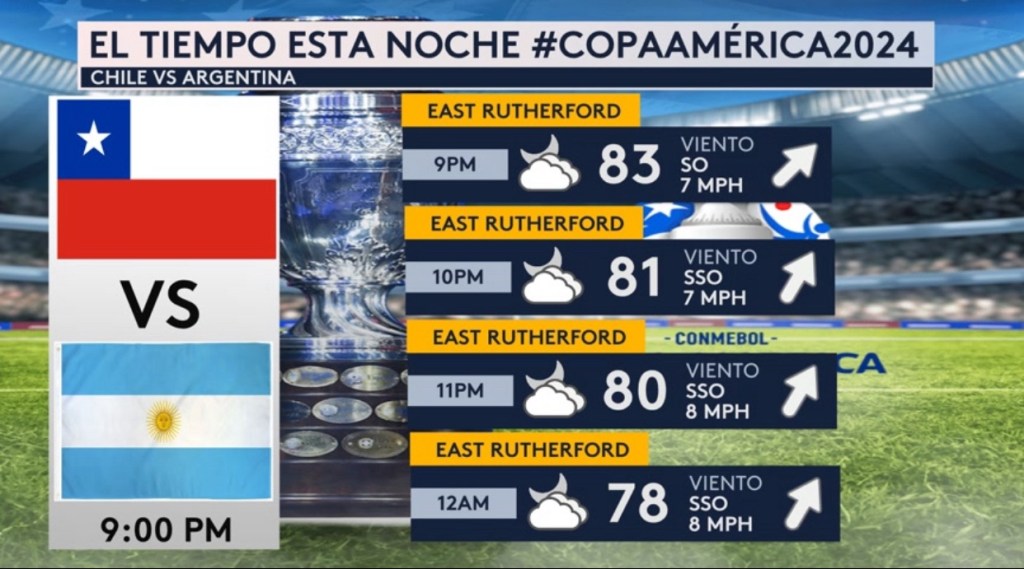 •Pronóstico para el segundo partido de la Copa América esta noche entre Chile y Argentina a las 9 PM en el Estadio MetLife en East Rutherford, New Jersey. Una noche tranquila con temperaturas en los 80°